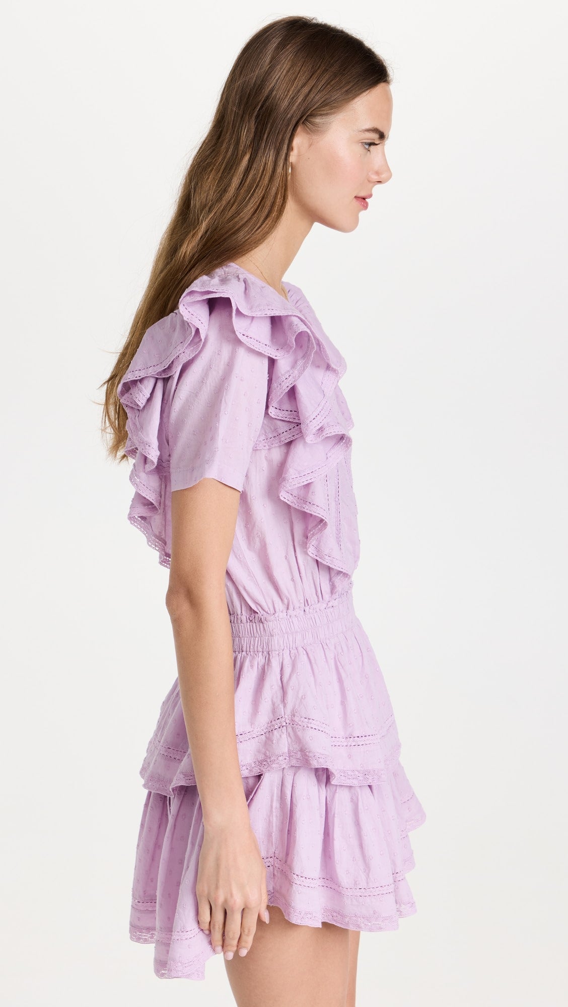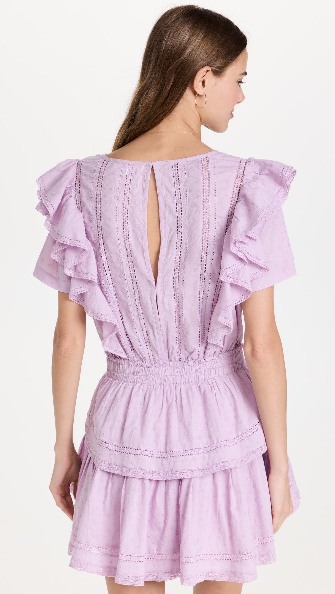 Elevate your wardrobe with the LoveShackFancy Natasha Dress. Designed with a round neck and short sleeves, this dress features delicate lace and charming ruffle trim. The hook-and-eye closure keyhole at the back adds a touch of elegance. Perfect for any occasion, this dress is a must-have for the fashion-forward.