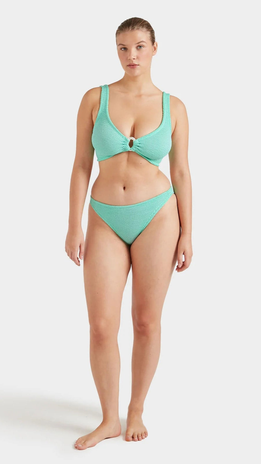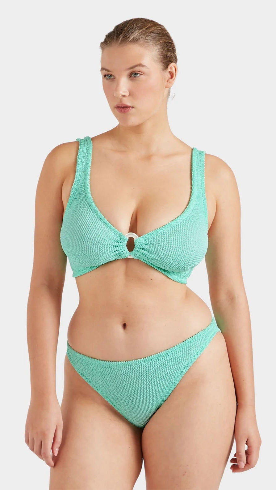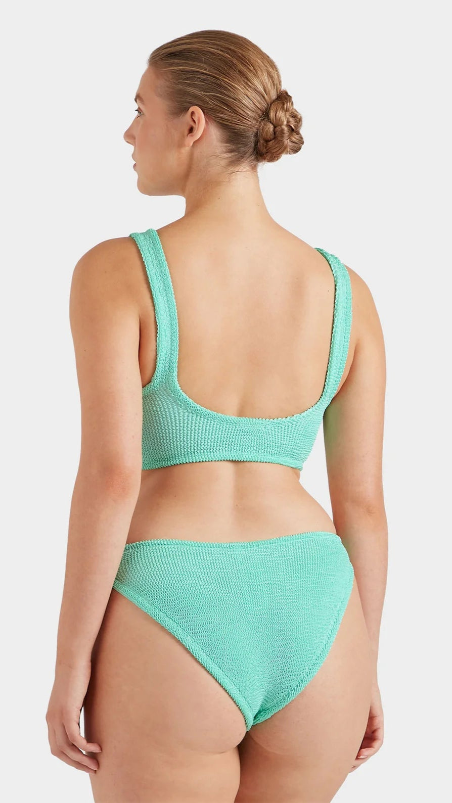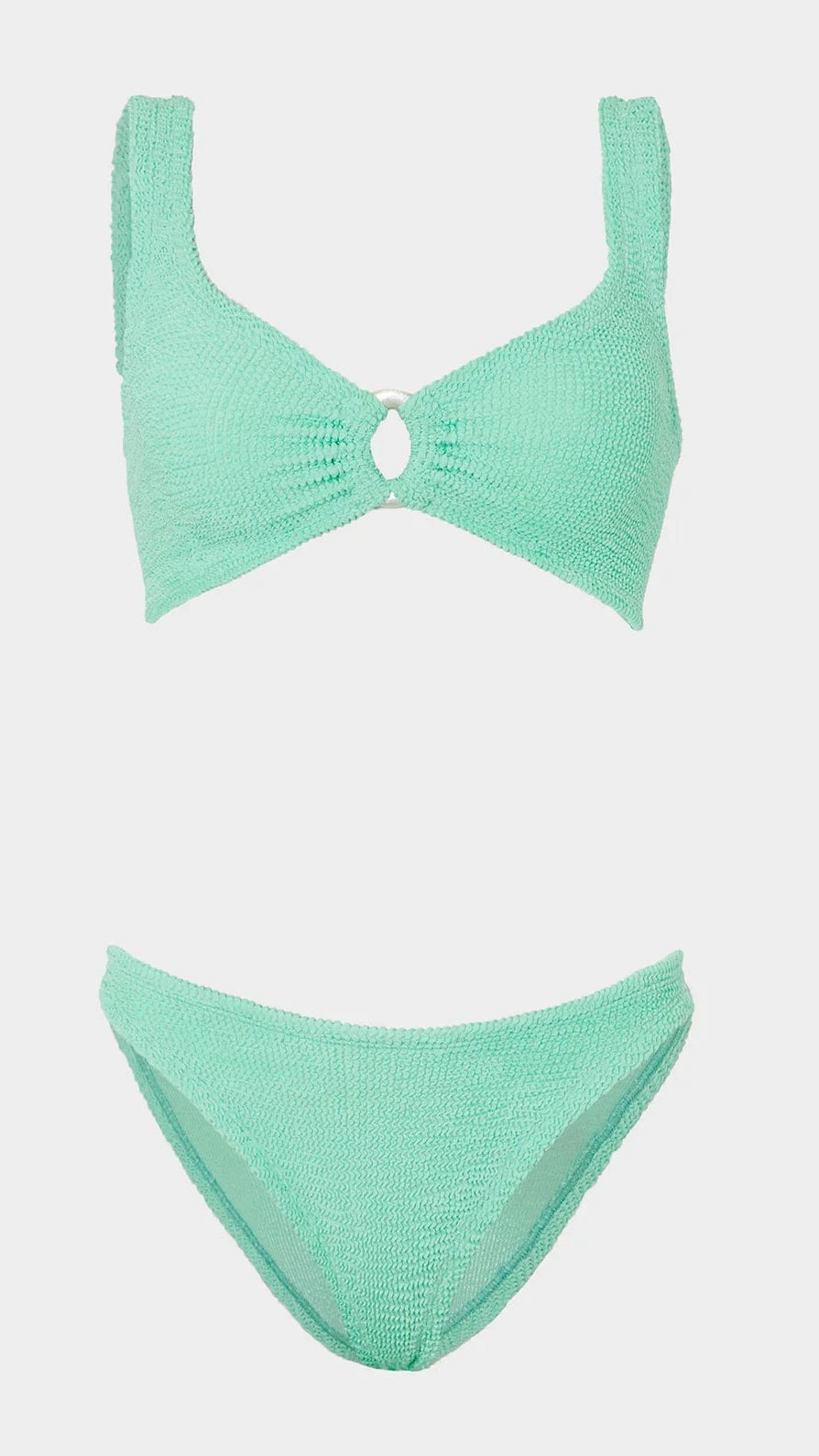 Get ready to turn heads with the Hunza G Julia Metallic Mint Bikini with Pearly Hoop! The stunning metallic mint colour and delicate pearly hoop detail make this a unique and eye-catching choice for any beach or pool day. You'll feel confident and stylish all day long in this one-of-a-kind bikini.