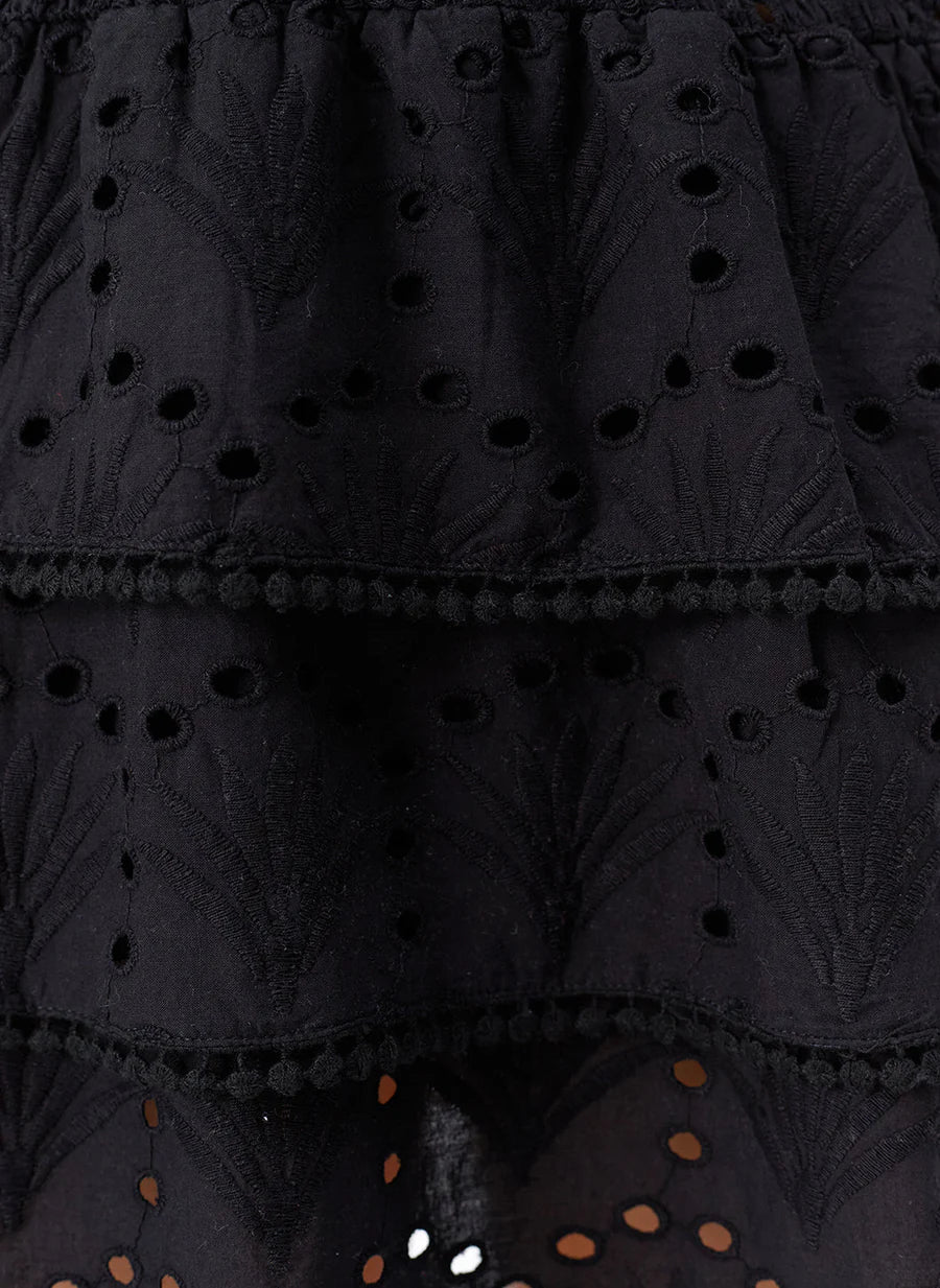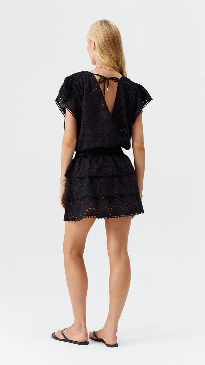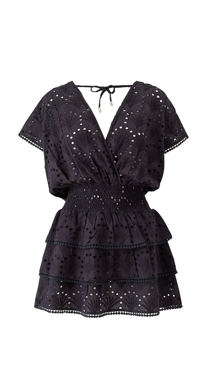 With its relaxed bohemian charm, the Melissa Odabash Jess Dress is a must-have for effortless holiday dressing. Chic and classic in Black, this style is crafted from premium, pure cotton. Falling to a short, mini length, this dress is cut for a loose fit with a comfortable shirred waist. It features a ‘V’ neckline with ties at the back, adorned with our signature gold branded cord-ends. Delicate crochet trims appear on the playful tiered skirt and short sleeves, completing the look.