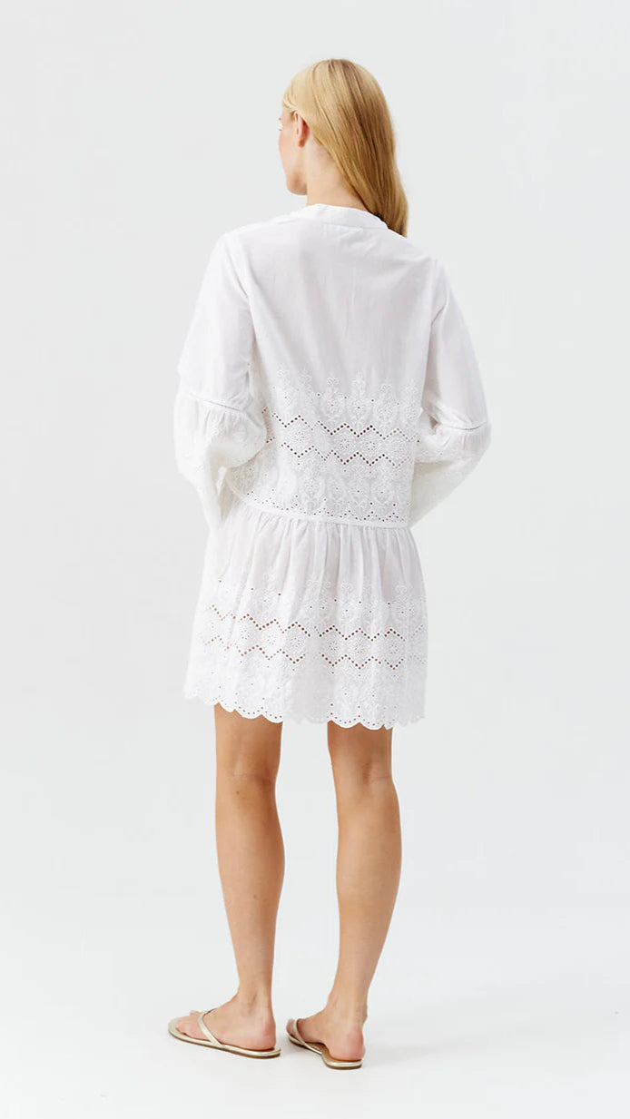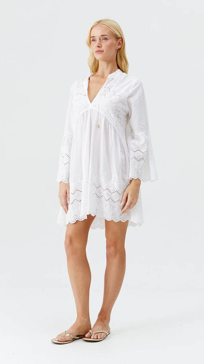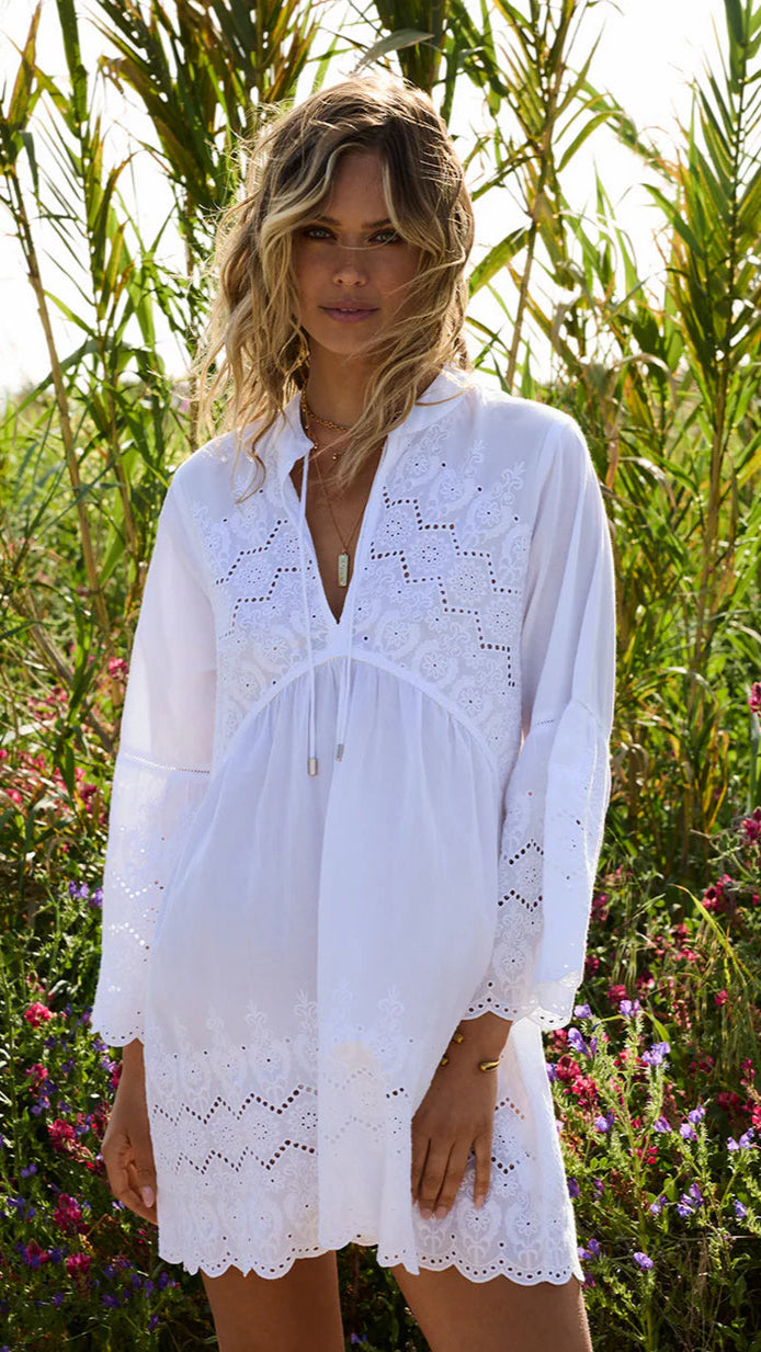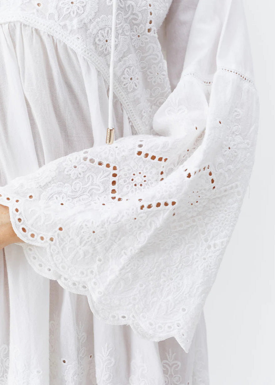 Add to your beach cover-up collection with the Sebena Kaftan. The perfect addition to your destination wardrobe, this chic White piece is crafted from pure, premium cotton. Falling to a short, mid-thigh length, it boasts delicate crochet detailing throughout and elegant bell sleeves. Tying at the neck, it features our signature gold branded cord-ends and is finished with pretty scalloped edges.