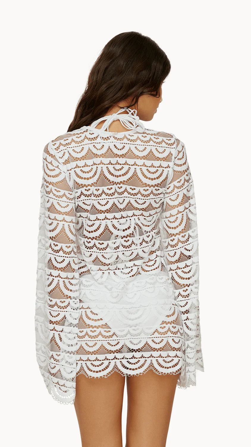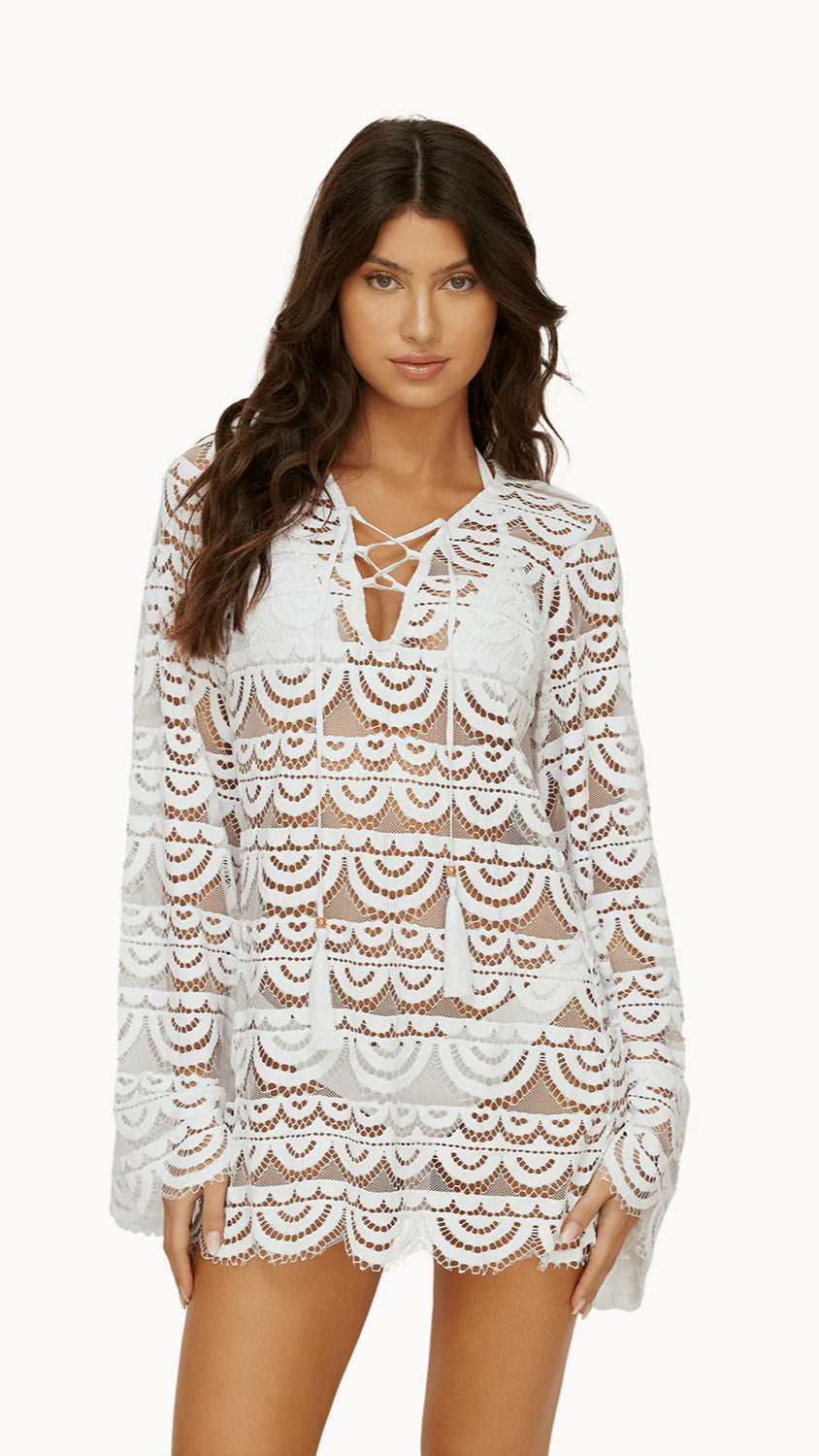 PQ's white lace tunic: the perfect boho-chic compliment to your summer or beach wardrobe. Delicate, hand-cut lace detailing designed for any occasion. This versatile cover-up can be worn after a dip in the water or as a breezy layer with shorts or jeans.