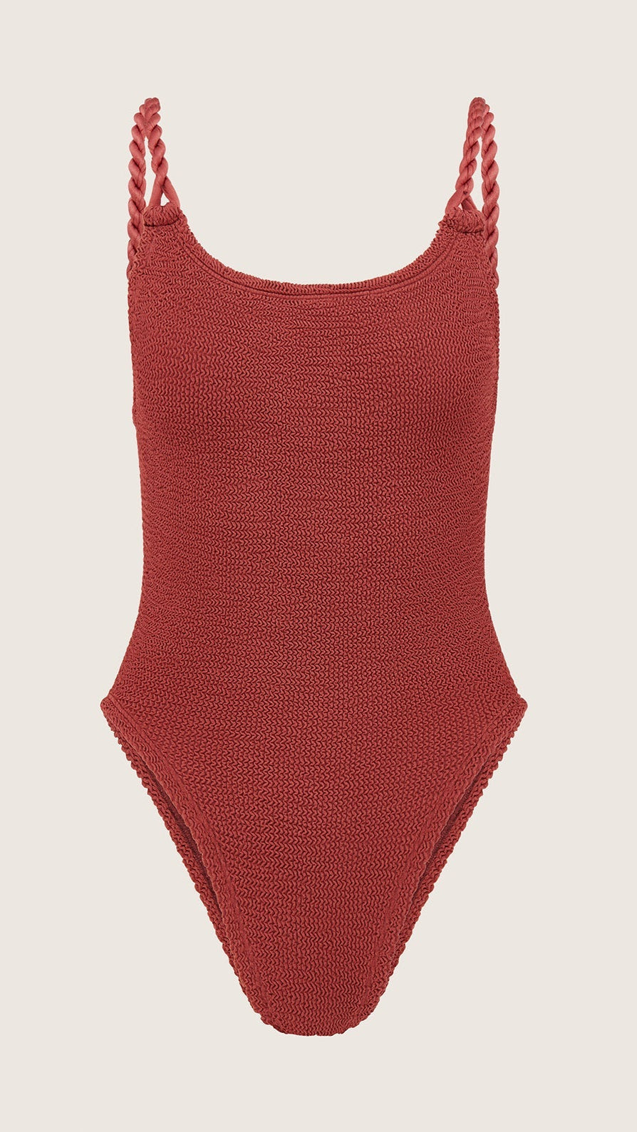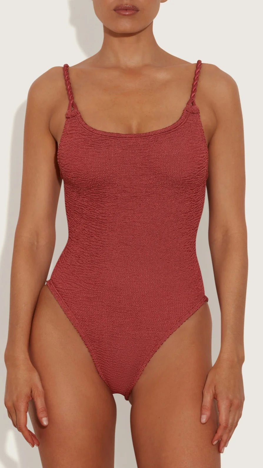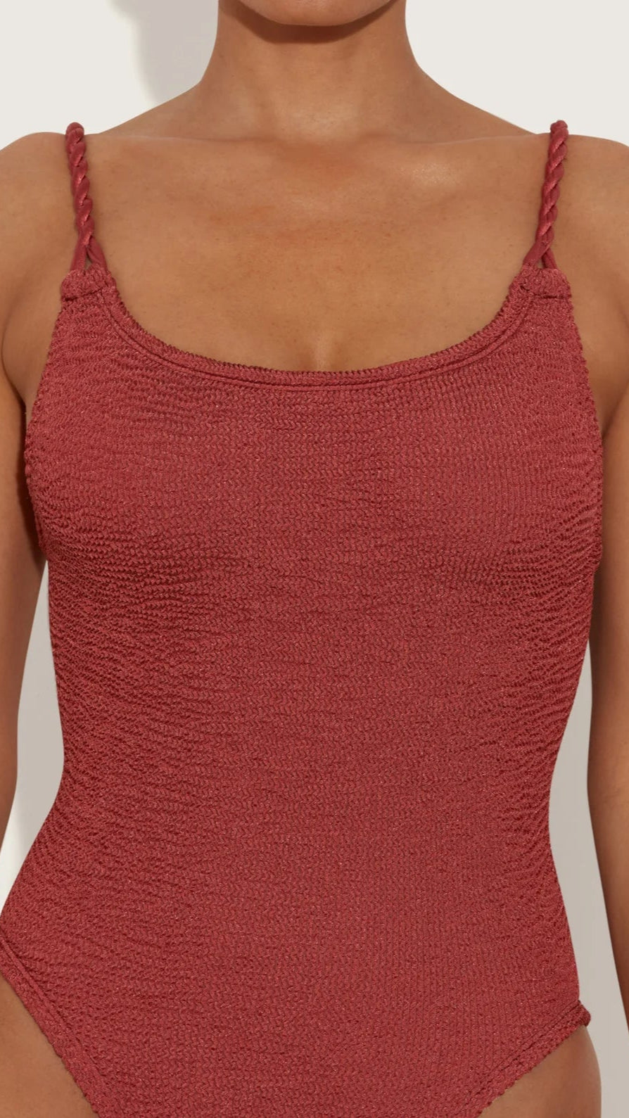 Indulge in luxury with the Camillie Metallic Rosewood Swim The stunning metallic rosewood colour complements the crinkle texture, adding a touch of elegance to your swimwear. Made with high-quality materials, this swimsuit promises comfort and a flattering fit. Elevate your beach style with the Camillie swim.